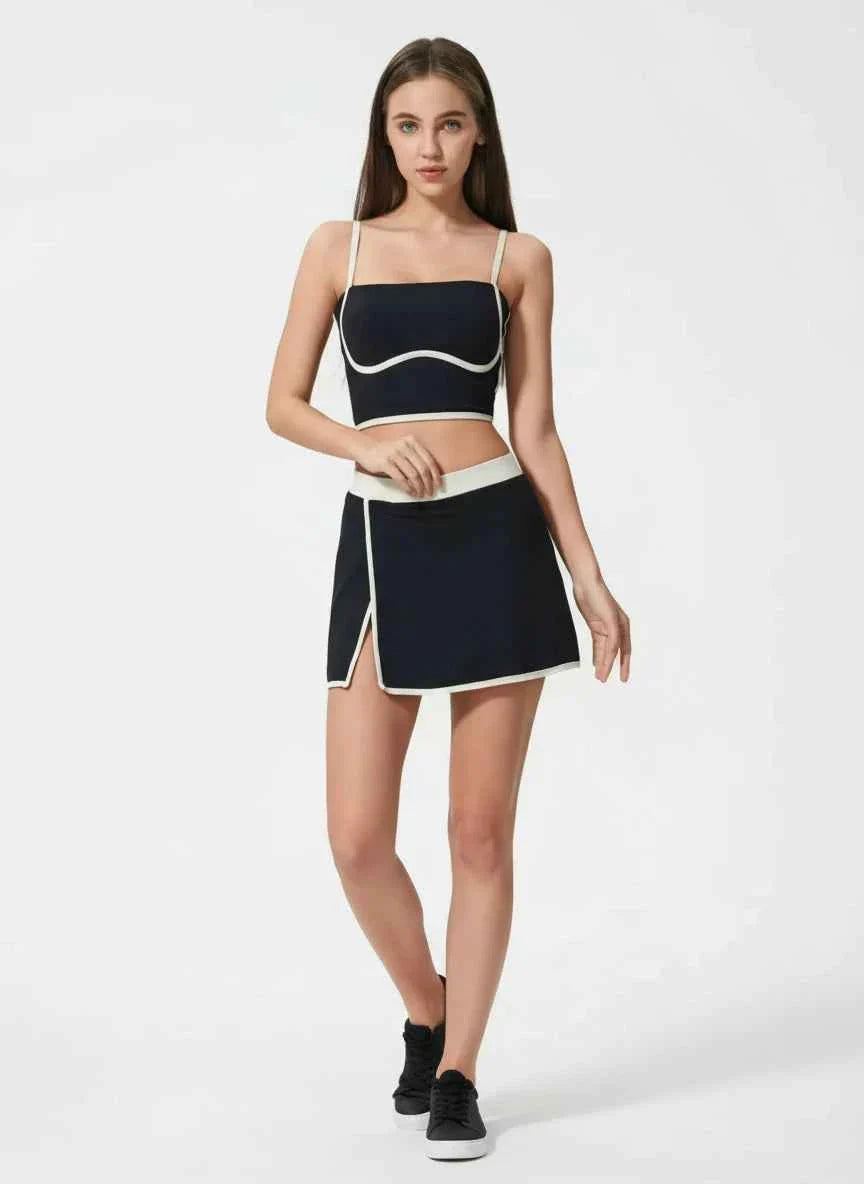 The Aurora Top features a square neckline with contrast trim, designed to provide both style and support. It includes removable cups and breathable, stretchy fabric that adapts to your body, making it perfect for workouts or a chic athletic look.